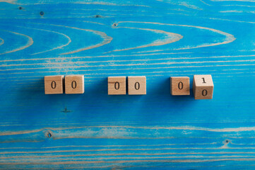 Six wooden blocks with 0 written on them and the last one turning to number 1