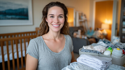 A pregnant woman organizes baby essentials in a bag, preparing for motherhood with bottles and clothing visible, wide-angle shot of nursery room with crib and toys in background, p