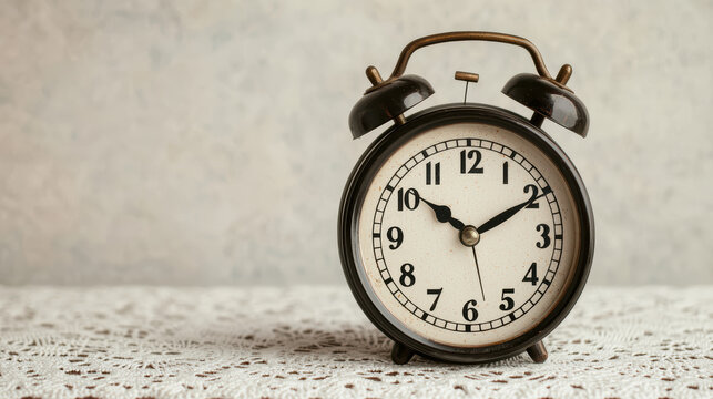 A vintage black alarm clock shows 11:10 on a lace-covered surface with a neutral background.