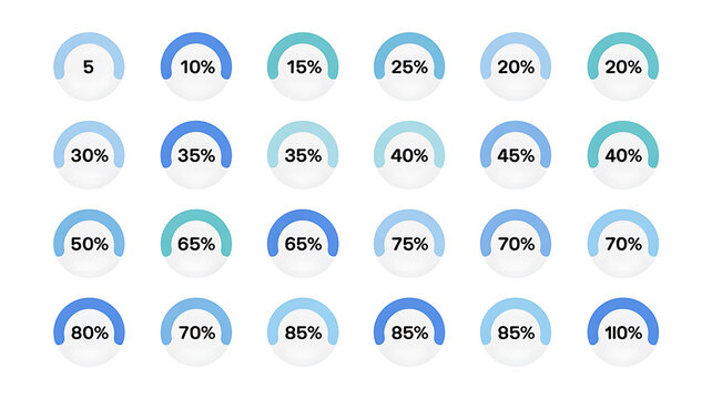 Set of loading indicators and progress bars. Circular meters from 0 to 100 ready to use for web design, user interface UI, or infographics. Includes 0, 10, 20, 30, 40, 50, 60, 70, 80, 90, 100.