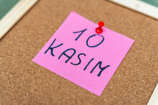 A pink sticky note pinned to a corkboard displays the handwritten date 10 Kasim, signifying an important reminder or event. The background is neutral, enhancing the note's visibility.