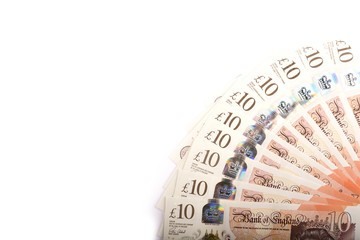 10 British pounds bills lies isolated on white background with copy space stacked in fan close up