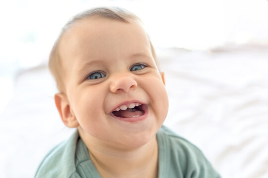 close-up portrait of a contented happy baby 10 months old inside laughing and looking at the camera