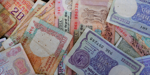 Vintage Old Indian Currency, A background of old vintage Indian currency notes.