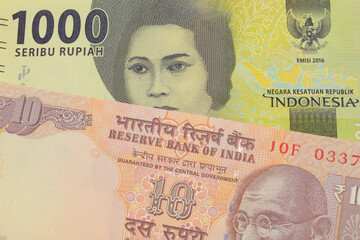 A macro image of a orange ten rupee bill from India paired up with a green one thousand bank note from Indonesia.  Shot close up in macro.