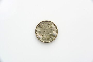 Japanese 100 yen coin closeup. Horizontal stories for news about the economy and banking in Japan. Scratched textured money from circulation. Dark hundred yen. Macro