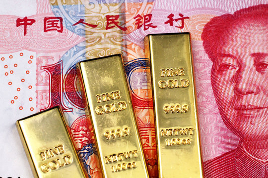 Three small gold bars up close with a red 100 Chinese yuan bank note in macro