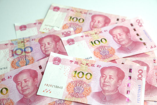 Renminbi, or RMB, CNY, currency of China. Set of one hundred yuan close up. Chinese money. Business concept. China map and national flag in white background