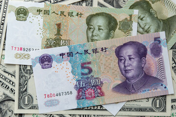 A composition featuring a 5 yuan banknote on the top, accompanied by a 1 yuan and 1 USD banknote.