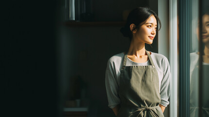 窓から春の光が入るカフェで撮影した、エプロン姿の女性店員の横顔人物ポートレート写真