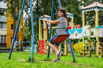joyful smiling teenager girl 11 years old rides on a swing on the playground looks at the camera close-up. High quality photo
