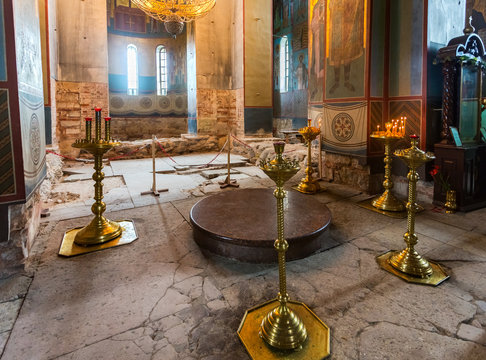 Interior of the Russian orthodox St. George Cathedral in the Yuriev Monastery in the neighborhood Veliky Novgorod, Russia, 1119 year