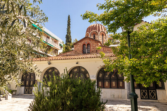 Athens, Greece. 11th century facade of the Byzantine Church of Saint Catherine showing masonry patterns, arches and dome elements characteristic of middle Byzantine architecture