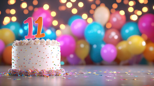 colorful birthday cake with number 11 on top, surrounded by festive balloons and confetti, creating joyful celebration atmosphere