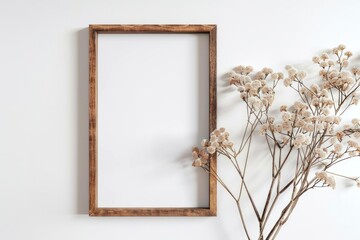Photo frame mockup on white background with wooden frame.