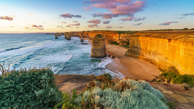 The 12 Apostles at sunset, near Port Campbell, Shipwreck Coast, Great Ocean Road, Victoria, Australia.
