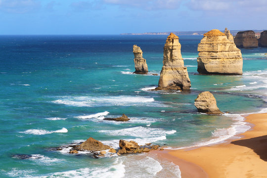 The famous rock formation Twelve Apostles surrounded by turquoise water at the Great Ocean Road in Victoria, Australia