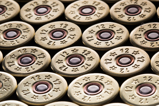 12 gauge plastic cartridge close-up. Background texture combat shells. The concept of hunting and crime