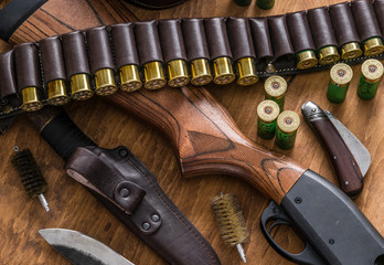 Hunting ammunition 12 gauge in leather bandolier on a wooden table. Focus on the cartridges