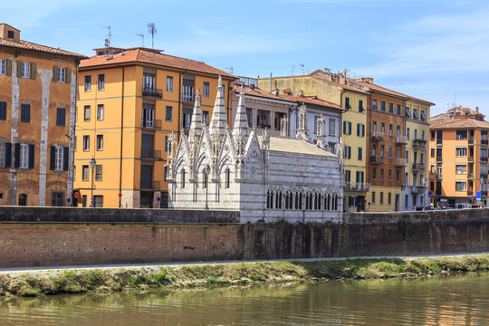 Pisa - historic townhouses along the Arno embankment. Small Gothic church of Santa Maria della Spina from 1230