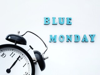 Sign with the words blue monday and one alarm clock at 12am on a white background