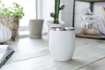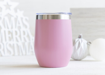 Pink blank Stainless Steel wine tumbler near Christmas baubles on table closeup, mockup