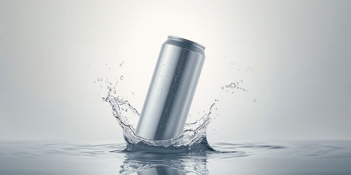 Sleek, blank 12oz metallic silver aluminum beverage can with condensation, standing upright on a seamless studio white background with soft shadows, concept for product branding mockup
