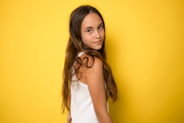 Little kid girl 12,13, 14 years old on isolated background. Children studio portrait. Emotional kids face. Happy teenager, positive and smiling emotions of teen girl.