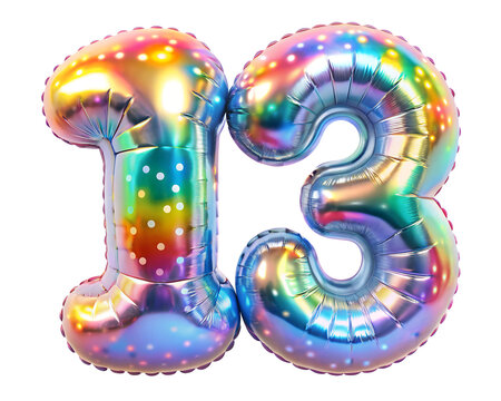 Number 13 thirteen made of silver inflatable balloons isolated on white background. Silver chrome helium balloons forming 13 thirteen number