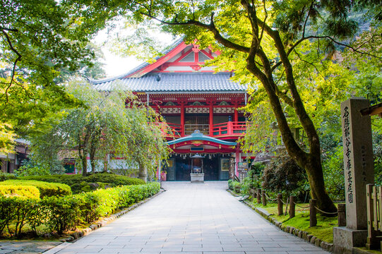Buddhist temple, in red color, splendorous among the green trees, located in the Natadera, one of the oldest temple complexes in Japan, close to 1300 years old.