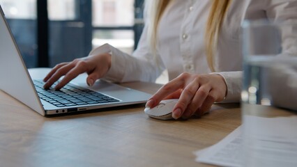 Unrecognizable concentrated Caucasian business woman typing laptop working in office girl female worker browsing computer work job in cyberspace marketing research employer busy with internet chat