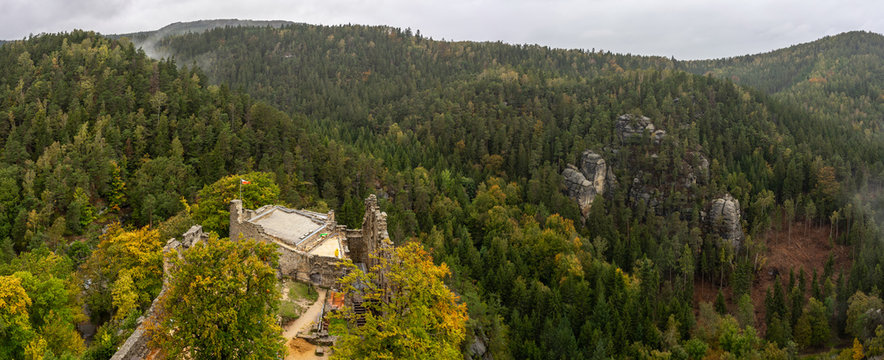 Panoramic view of Zittau Mountains and the ruins of Burg Oybin (1369) on the German border (Saxony) with the Czech Republic.