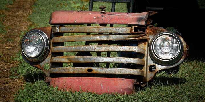 Canandaigua NY Steam Engine Association Pageant of Steam on Saturday, Aug 14, 2021. Old Antique Metal Truck or Car Grill for sale at Flea Market. Paint and Rust Cover this Toy Car. Upstate NY.