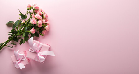Gift, present box decorated with pink ribbon bow, rose flowers on pink background top view. Valentine's day, 14 February, birthday, 8 march women's day gift. Love and romance.