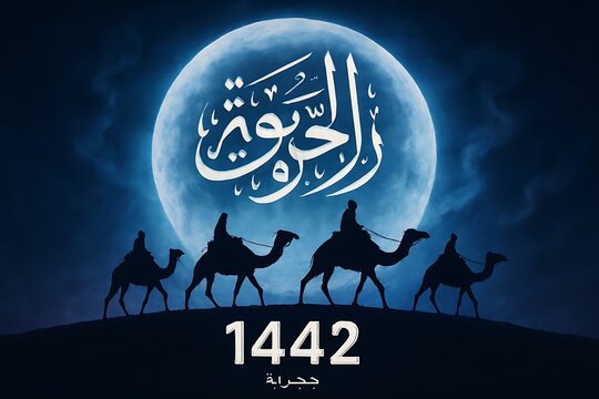 Islamic new year 1442 celebration with camel caravan under a full moon