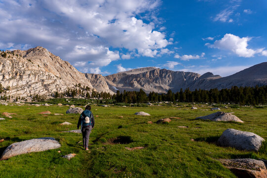 Woman hikes through a meadow with Mount Langley in the distance