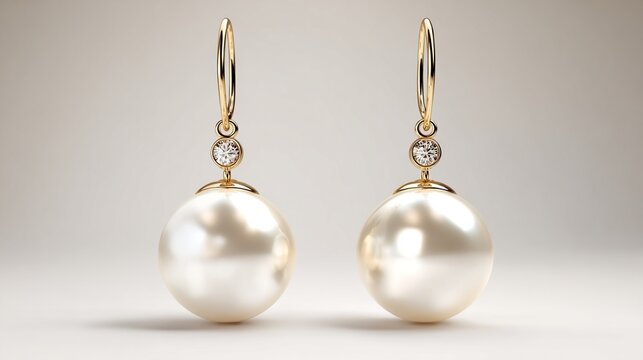 Elegant pearl and diamond drop earrings.  Lustrous spheres of cream-colored pearls dangle delicately from 14k yellow gold hoops, accented by a brilliant diamond