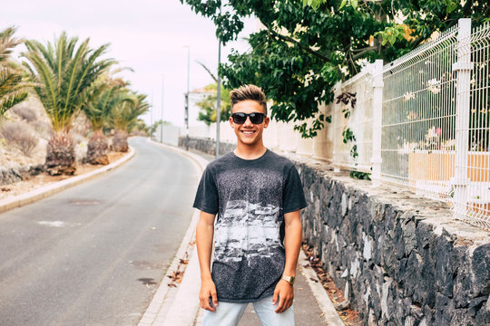 Beautiful young caucasian handsome blonde teenager standing in front of the camera with long road in background - concept of people outdoor in portrait picture