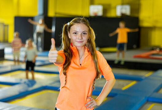 Happy smiling long haired teenage girl giving thumbs up while enjoying time on trampolines in modern inflatable amusement park