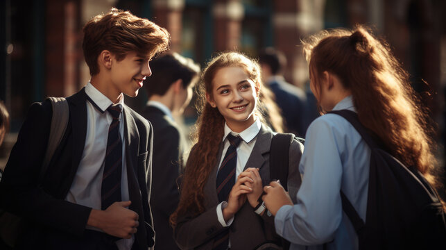 A group of high school teenagers chatting with each other on the street in front of the school building.Created with Generative AI technology.