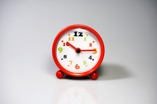 Pink alarm clock setting at fifteen before noon or midnight. Time conceptual.