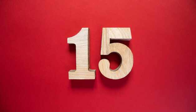 3D number 15 made of wood. Flat lay on red background with copy space.