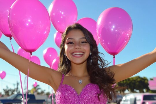 A cheerful 15 year old girl enjoys her Quinceanera surrounded by pink balloons in a bright, sunny outdoor venue