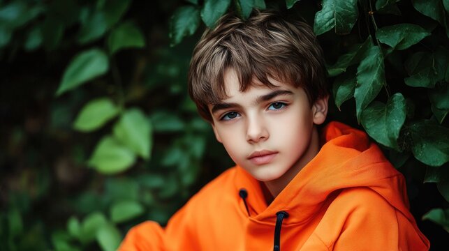Handsome teenage boy aged 13 to 16 in vibrant orange hoodie seated among lush green foliage, showcasing youthful charm and natural beauty.