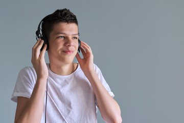 Portrait of teenage girl 15 years old, smiling pretty girl in gray sweatshirt