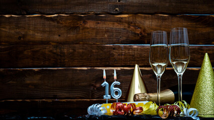Solemn background for the anniversary with the number  16. Happy birthday background on brown wooden background with champagne bottle and champagne glasses. Beautiful holiday decorations copy space.