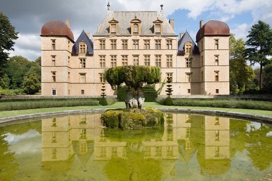 Château de Fléchères à 01480 Fareins. (XVII) se reflétant dans l'eau du bassin. Il a été construit de 1606 à 1625 et est conservé intact