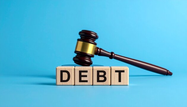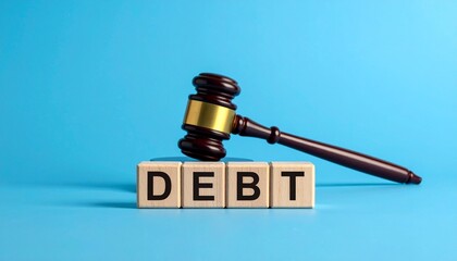 Judge’s gavel resting above the word "DEBT" spelled out in wooden blocks on a vibrant blue surface