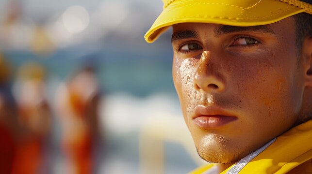 Professional lifeguard portrait showcasing vigilance and readiness in hyper-realistic 16k resolution