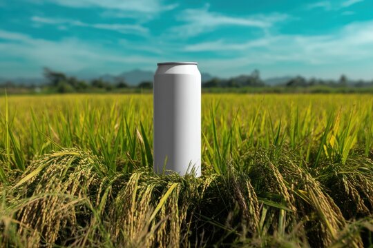 Product Photography Mockup of Blank Can in Front of Blurred Paddy Field